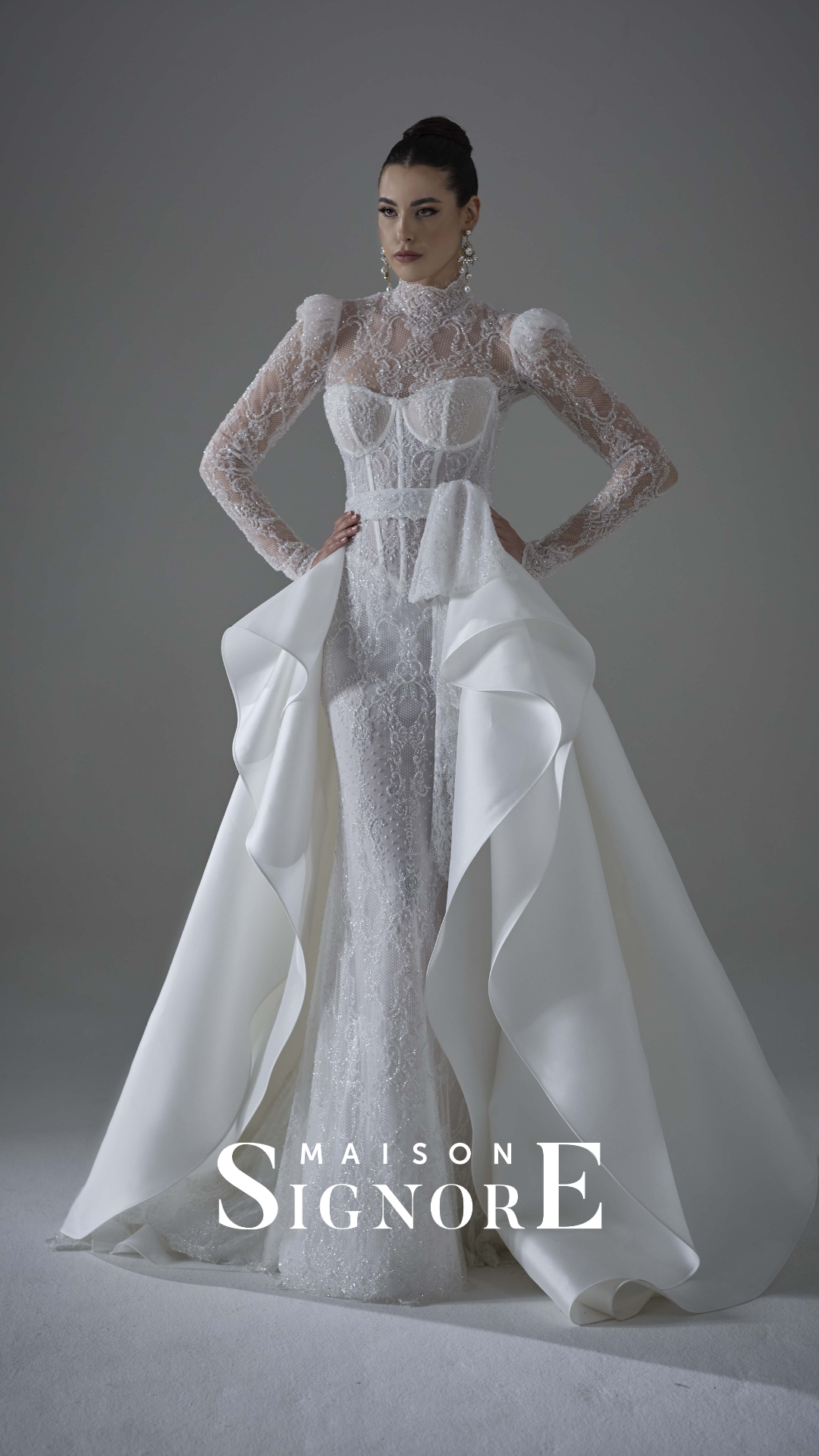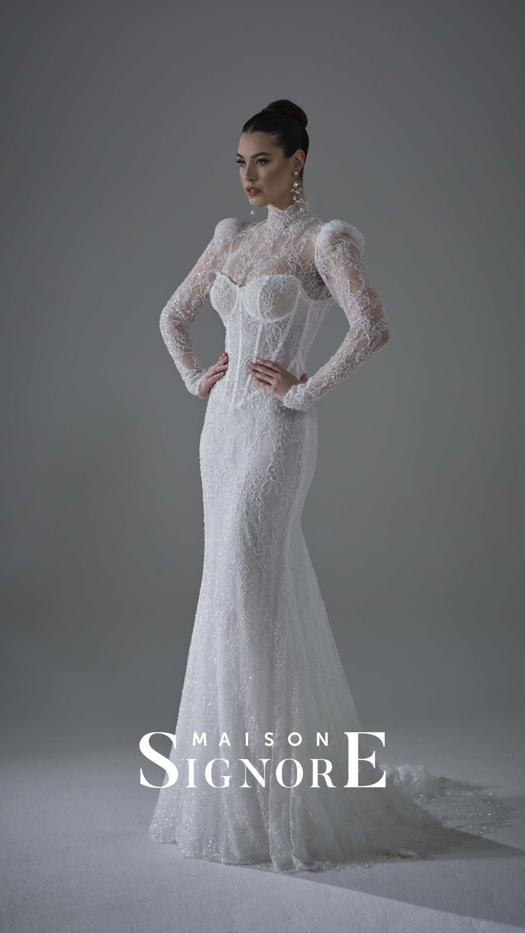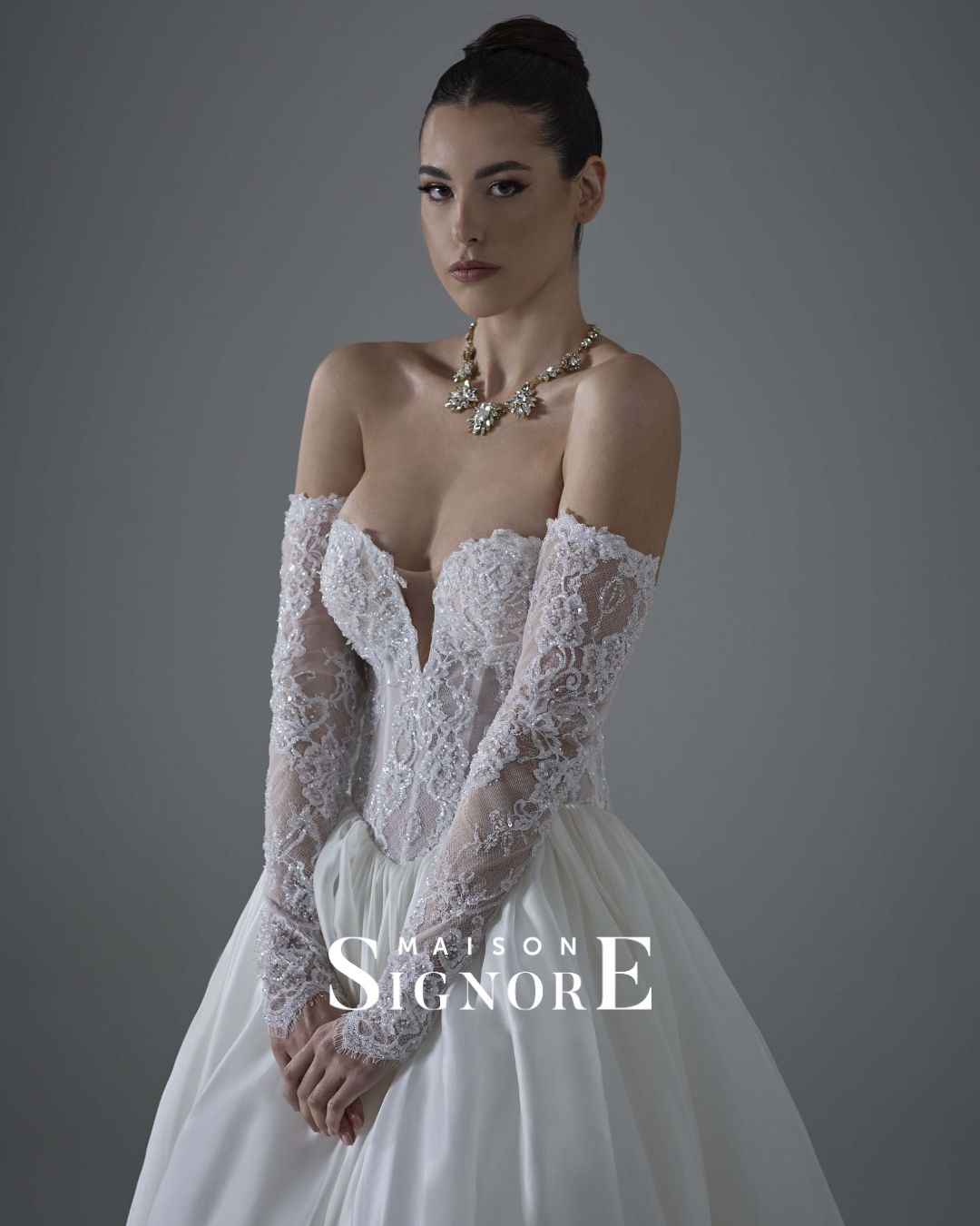 „Maison Signore hat es sich zur Aufgabe gemacht, zeitlose und zugleich moderne Kleider zu entwerfen. Jedes Kleid wird in Italien von Hand gefertigt und überzeugt durch eine makellose Passform sowie die Verwendung der luxuriösesten Stoffe der Welt. Die raffinierte Ästhetik und die erstklassige Handwerkskunst haben die Marke zu einem absoluten Liebling unter anspruchsvollen Bräuten gemacht. Die Passform und die Stoffe stehen bei Maison Signore immer im Vordergrund, was sofort deutlich wird, sobald man ein Kleid der Marke anprobiert.