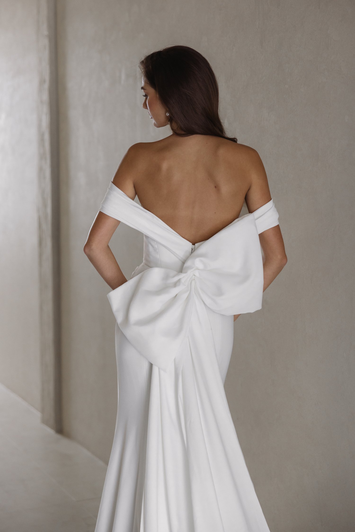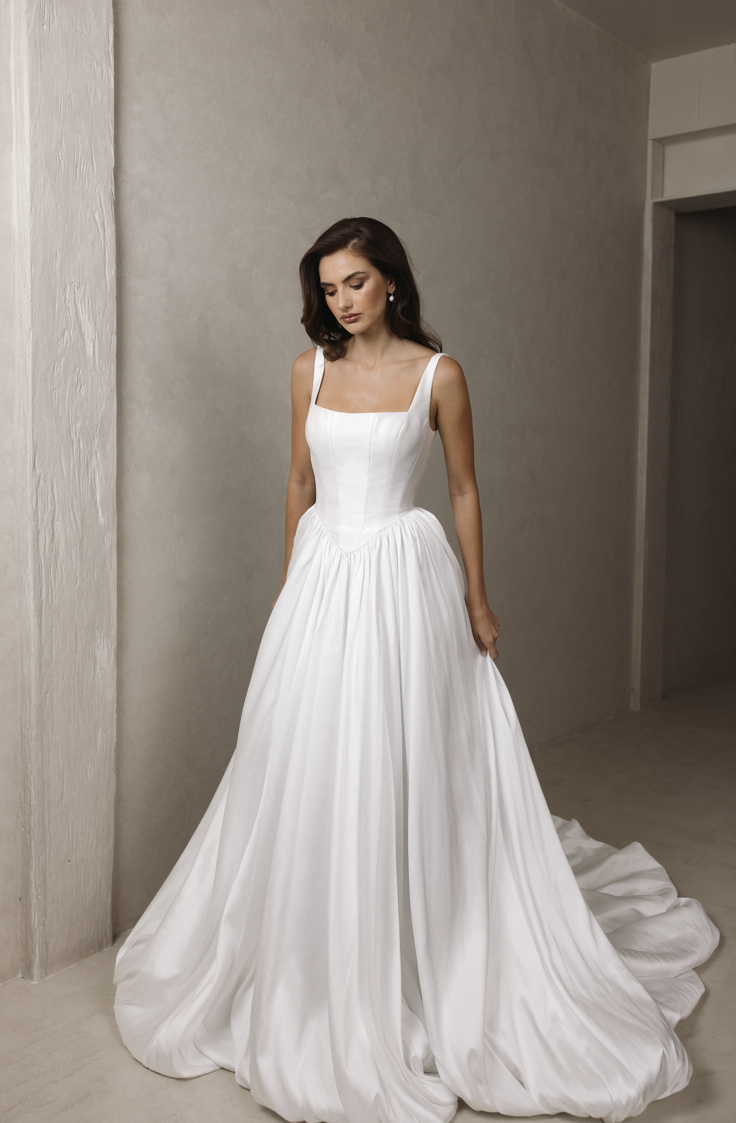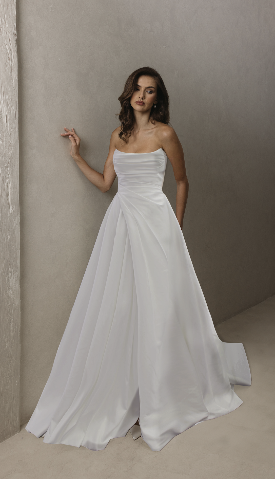 Jedes Kleid ist perfekt auf den einzigartigen und persönlichen Stil jeder Frau zugeschnitten. Es ist unbeschwerter Luxus für die Braut, die sich sowohl raffiniert als auch ganz sie selbst fühlen möchte. Die Stoffe fühlen sich wie Poesie an – butterweicher Satinkrepp und ihr charakteristischer Mikado – ausgewählt, um sich wunderschön zu bewegen und sich unglaublich auf der Haut anzufühlen.