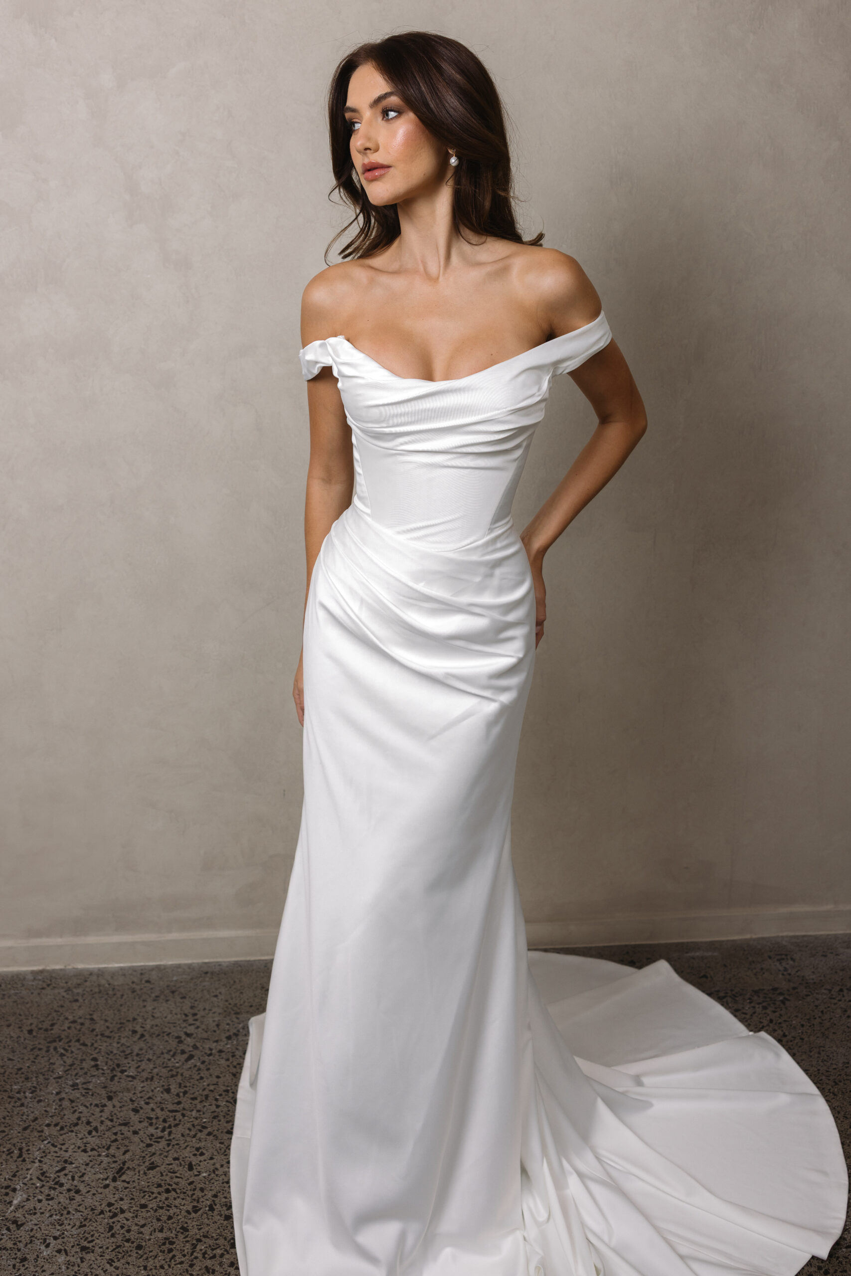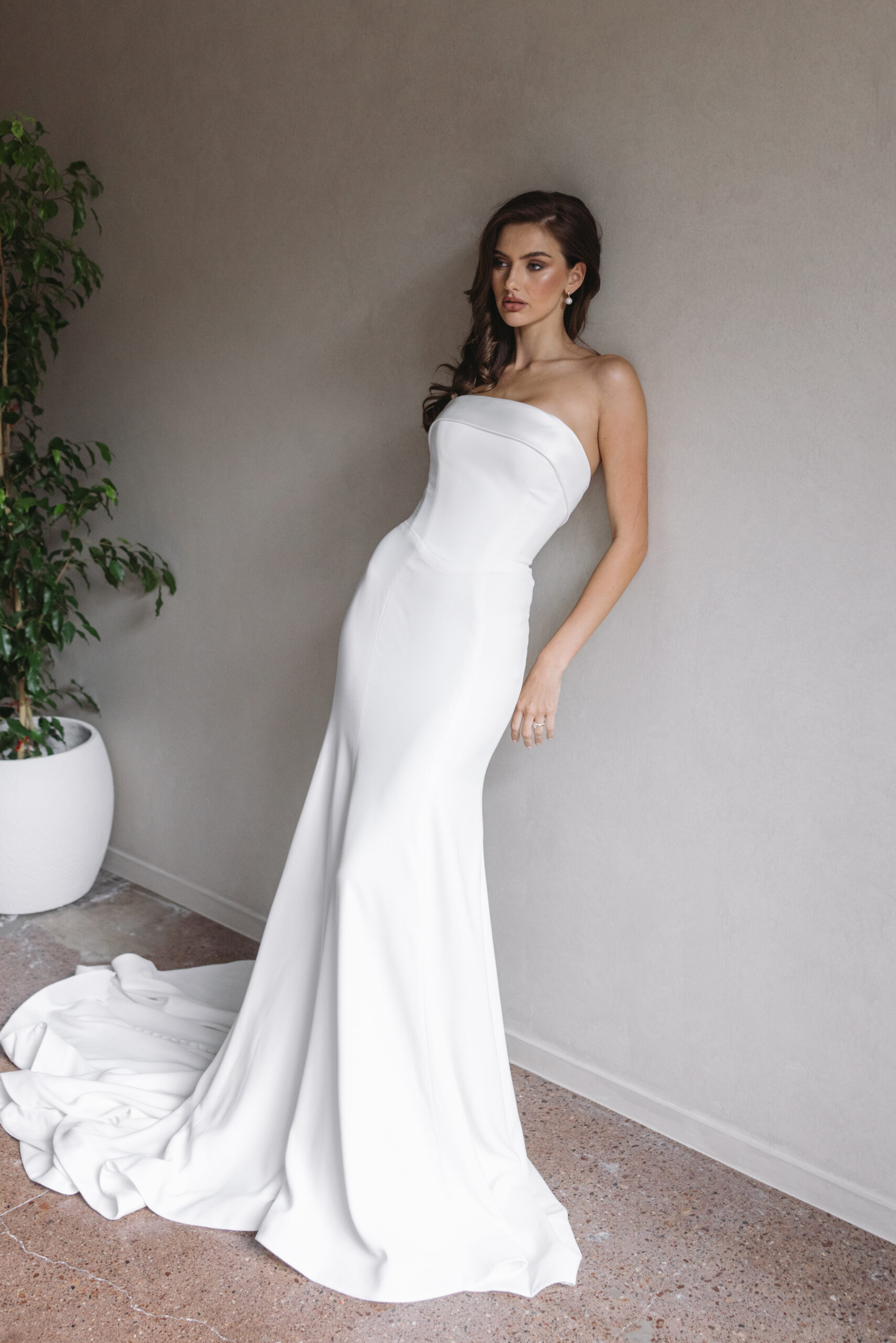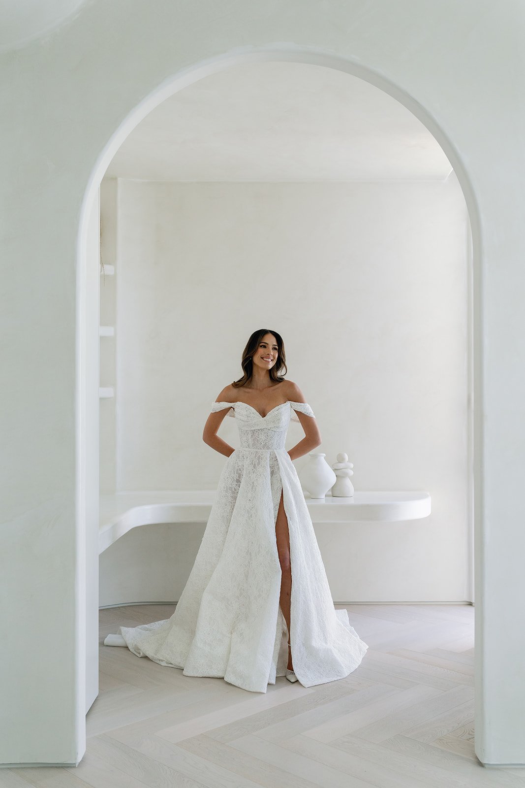 Jedes Kleid ist perfekt auf den einzigartigen und persönlichen Stil jeder Frau zugeschnitten. Es ist unbeschwerter Luxus für die Braut, die sich sowohl raffiniert als auch ganz sie selbst fühlen möchte. Die Stoffe fühlen sich wie Poesie an – butterweicher Satinkrepp und ihr charakteristischer Mikado – ausgewählt, um sich wunderschön zu bewegen und sich unglaublich auf der Haut anzufühlen.